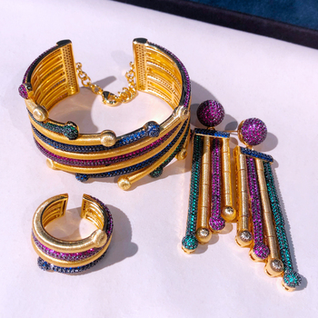เซ็ตต่างหูแหวนเพทายหลากสีสุดหรู T358A 3ชิ้นเครื่องประดับเจ้าสาวสไตล์แอฟริกัน/อินเดีย/ดูไบสำหรับผู้หญิงและเป็นของขวัญ