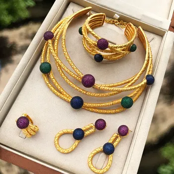 T175B多層イタリアゴールドボールネックレス4個ナイジェリアブライダルジュエリーセット女性用ウェディングジルコンドバイインドジュエリーセット