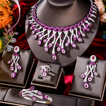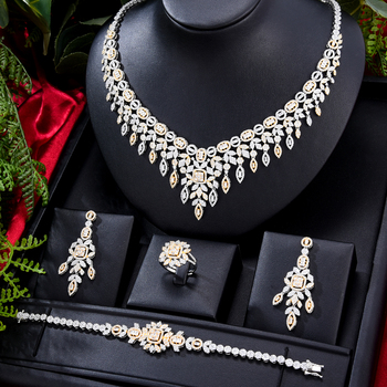 ชุดเครื่องประดับดอกไม้ดูไบแอฟริกันคุณภาพสูง4ชิ้น T121B เพทายลูกบาศก์สร้อยคอปาร์ตี้งานแต่งงานอินเดียสำหรับเจ้าสาวของขวัญที่สมบูรณ์แบบ